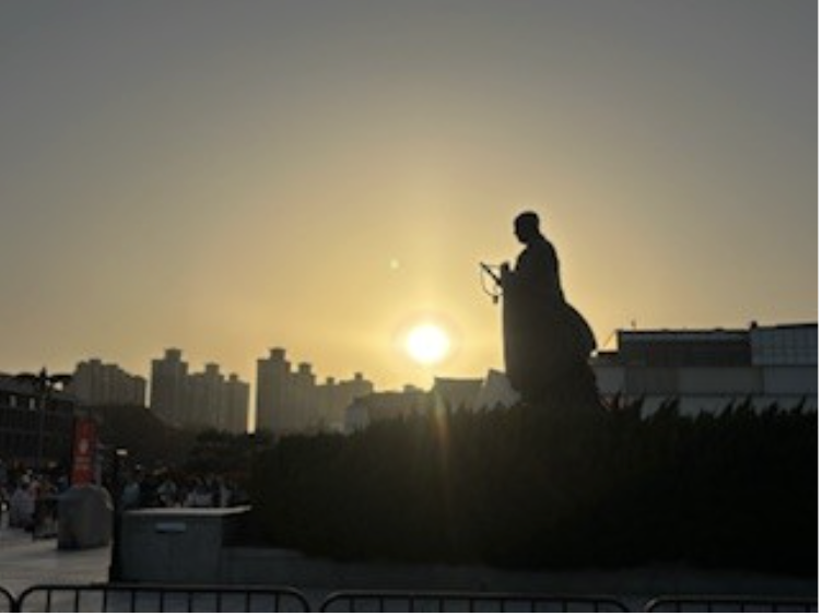 ふと気がつくと、陽は傾きかけ、空は茜色に染まり始めていた。夕陽を浴びて黄金色に輝く大雁塔、そしてその麓に立つ玄奘三蔵の像。その二つのシルエットが夕闇に溶け込み、重なり合う姿は、まるで玄奘の不屈の精神そのものが、この地に深く根を下ろしているかのようだった。その荘厳で美しい光景に、私はしばし時を忘れ、静かに手を合わせた。